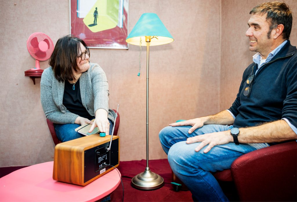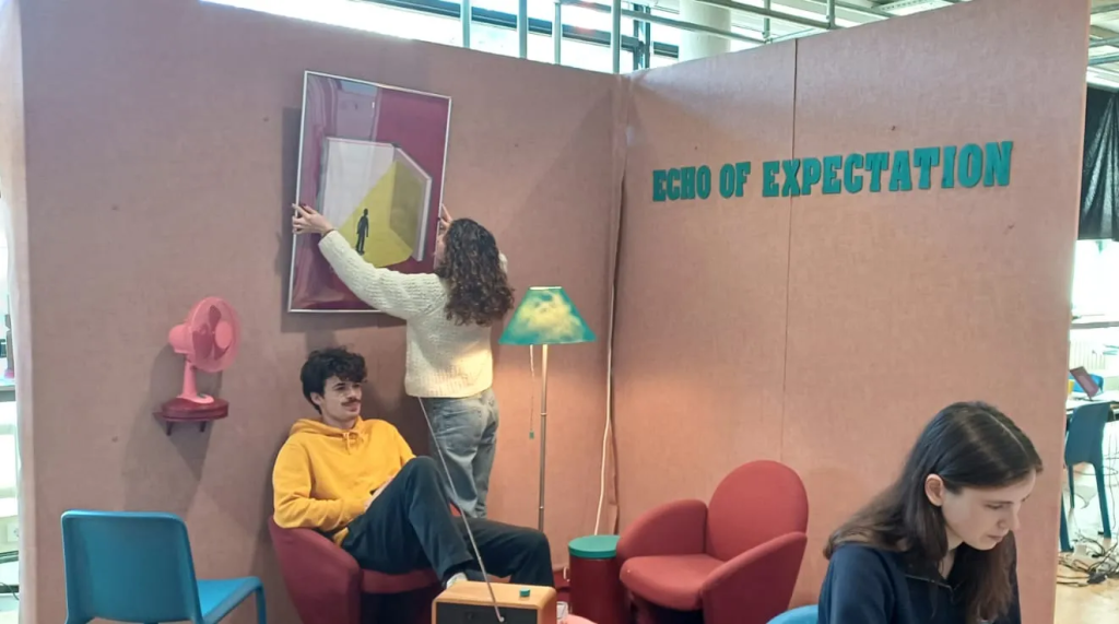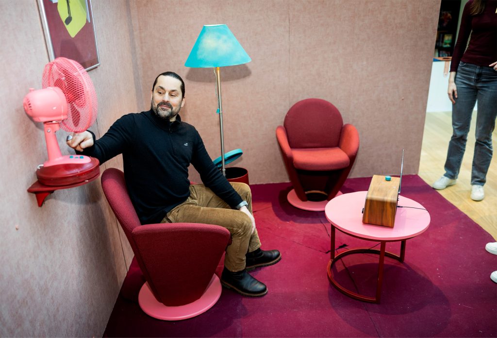 Visitors step into a cozy room, with warm red tones, where every interactable object stands out in blue. The space looks familiar at first, but once inside, nothing behaves the way they expect. When they try to switch on the lamp, a trash can opens. When they adjust the radio, the lamp lights up instead. The fan controls the radio, the pedal bin controls the fan, all responding in unexpected ways. Simple tasks turn into small puzzles, and familiar actions no longer lead to familiar results.