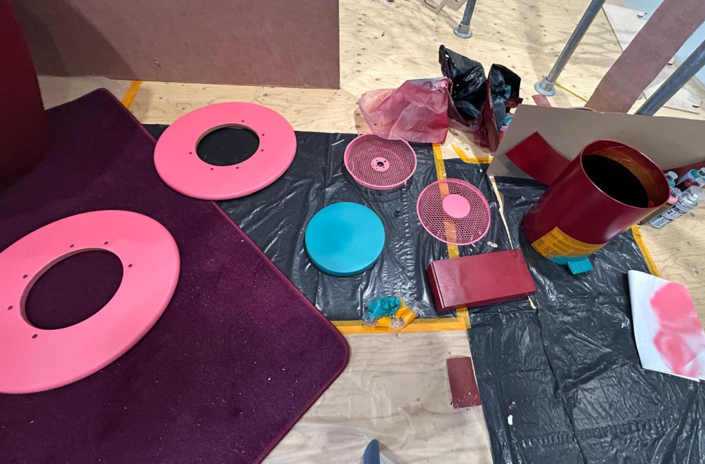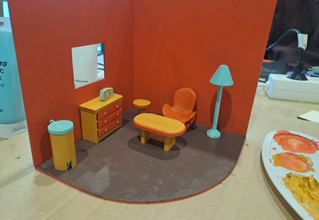 From second-hand shops, we gathered all the furniture for our prototype. For the walls we used MDF plates connected to scaffolding pipes. After deciding on the color pallet, we spray-painted all of the objects.