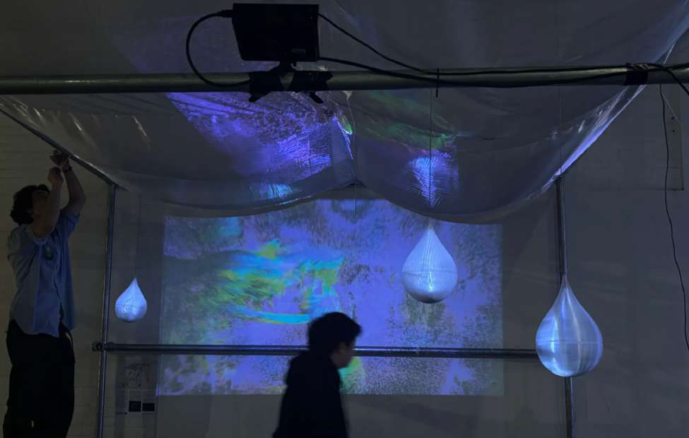 color, responding to each gesture. Users can also interact directly with the two drops that are hanging from the ceiling; touching the button on a drop alters the color or speed of the visuals, further reinforcing their presence within the environment.