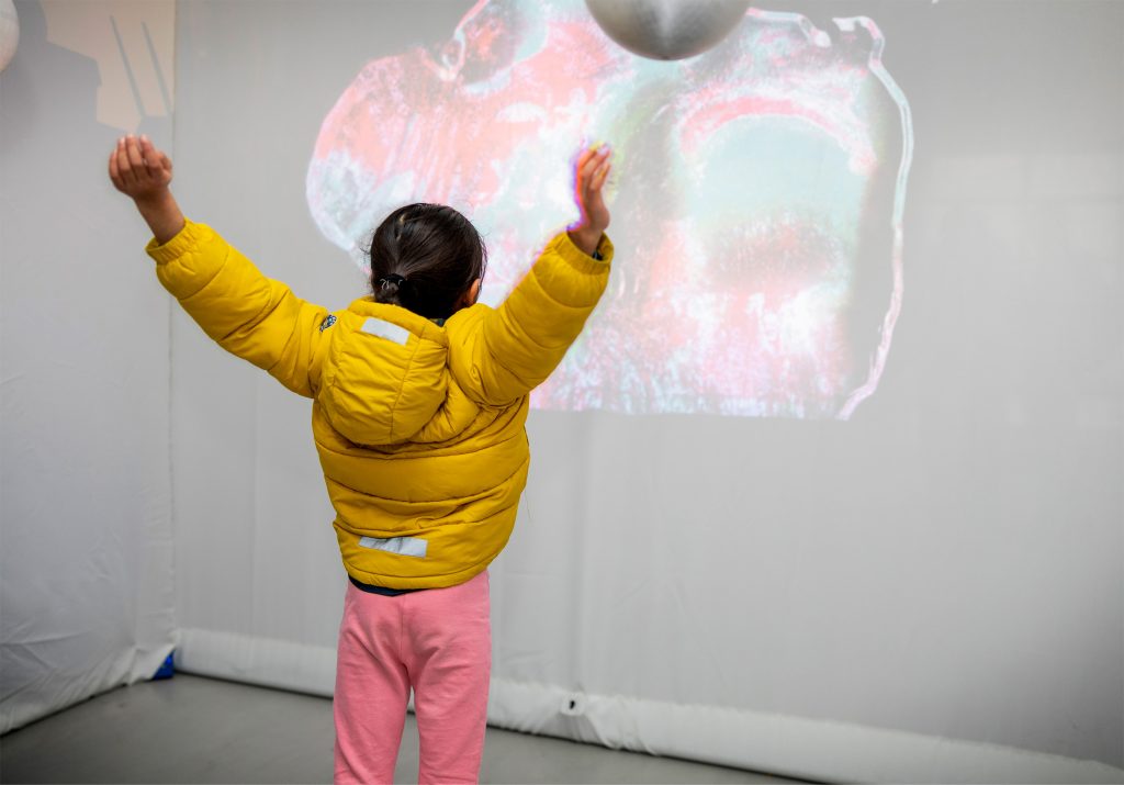 Visitors enter a dim, ambient space where soft light and sound invite the user to enter and explore. At first, the projection rests quietly, waiting. As people move, the visuals awaken, expand, and burst into