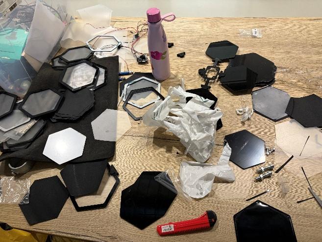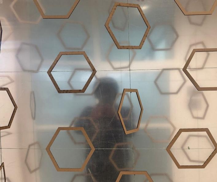 We had two types of film: a white translucent film and a black film. By layering and combining these materials, we were able to create a third value that created the gradient across the panels. We cut out all of the individual films for the panels by hand.