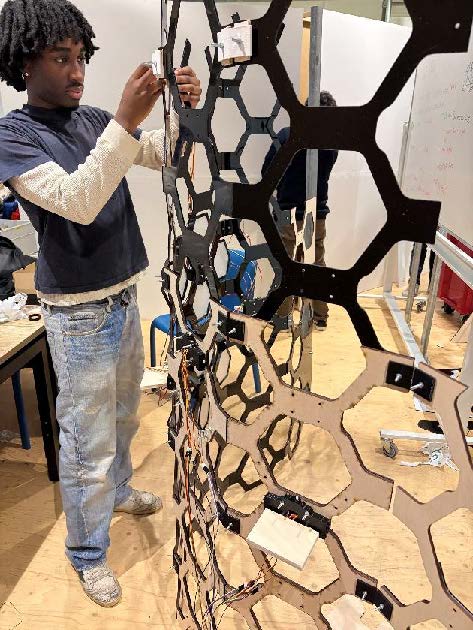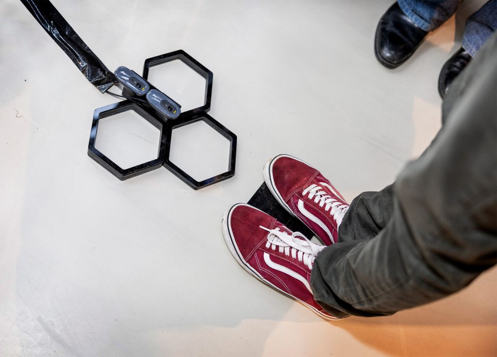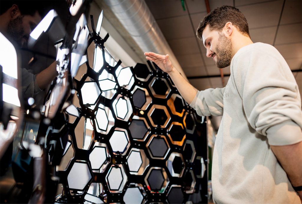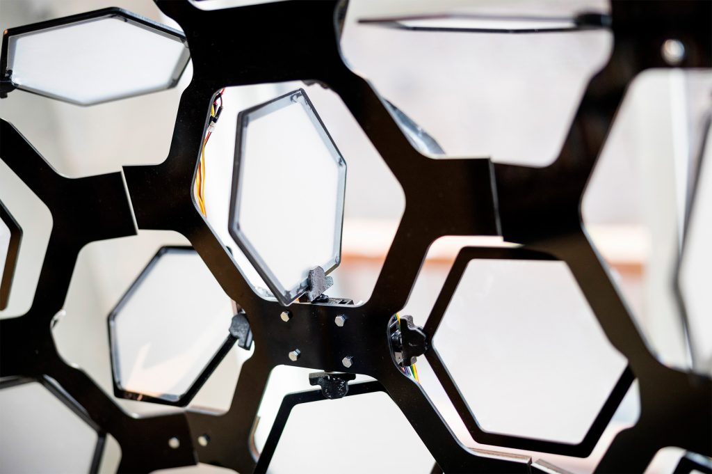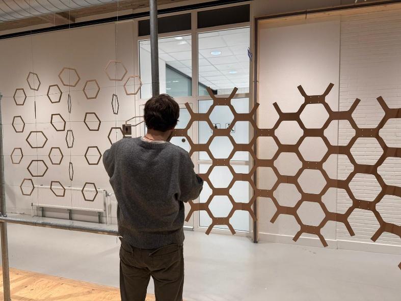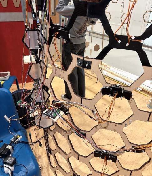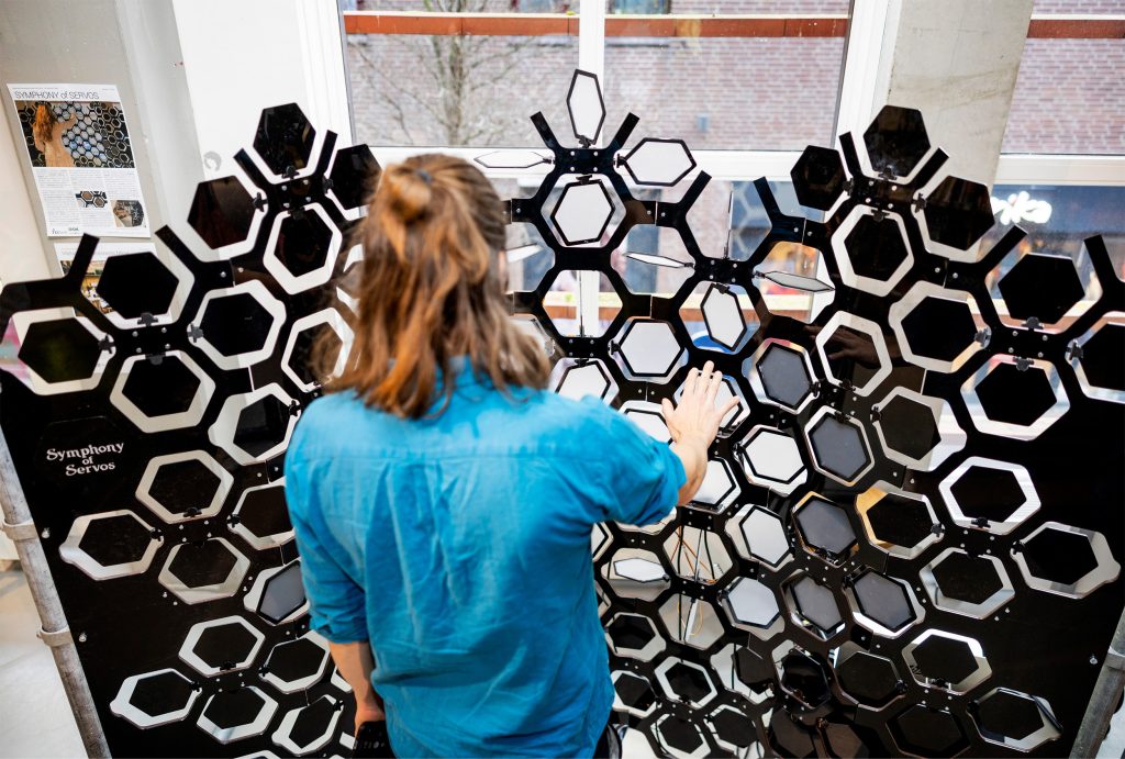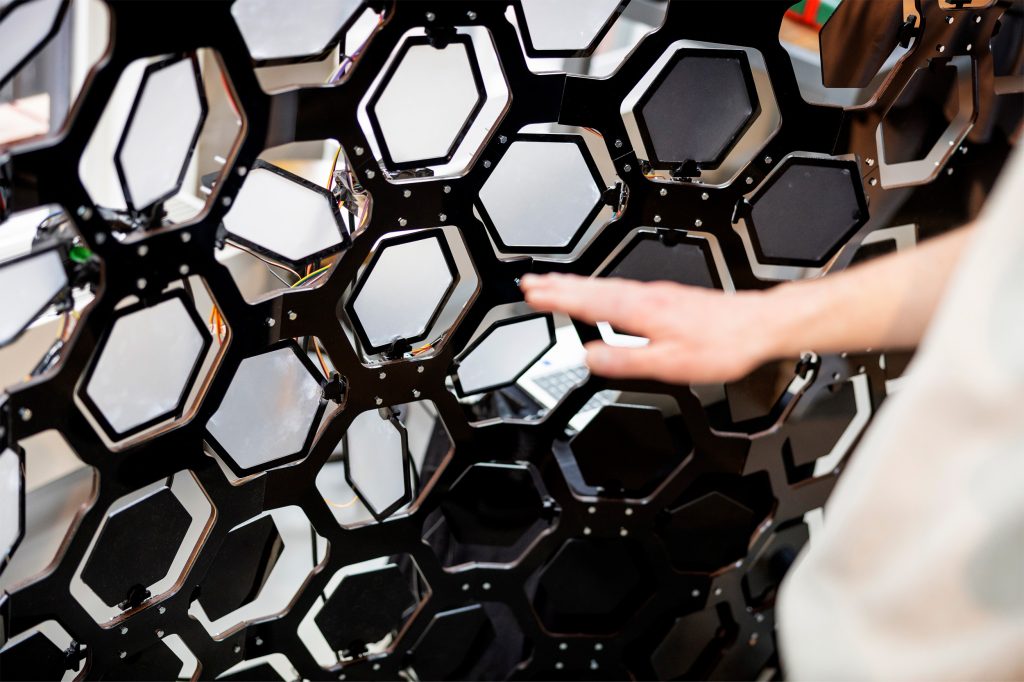 When you stand in front of it, a camera detects the position of your hand, and the panels respond. They move as you move – but more importantly, each panel is linked to a musical element. By interacting with the wall, you’re not just triggering movement; you’re actively shaping a music track. You might bring out the piano, soften the drums, or highlight a melody simply by guiding your hand across the surface.
