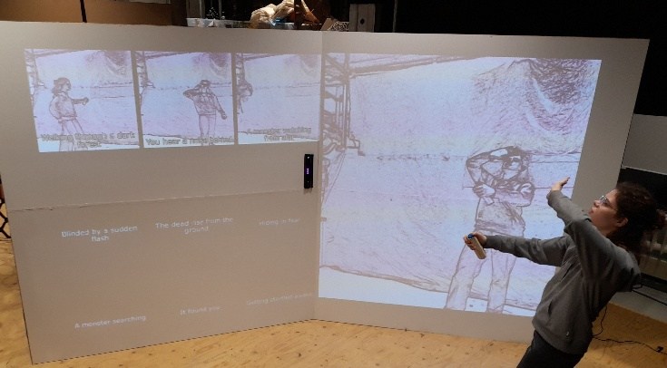 We wanted to further develop the storytelling aspect. On the right side, you can act out a story, and on the left side, you can see your story take form.