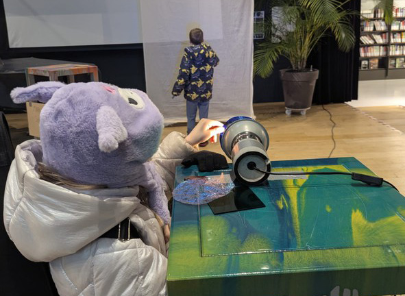 When someone steps in front of the book, they see a live representation of their shadow. Once they are ready, they can use a handheld button to capture the image. The captured scene is then added to the story on the opposite page.