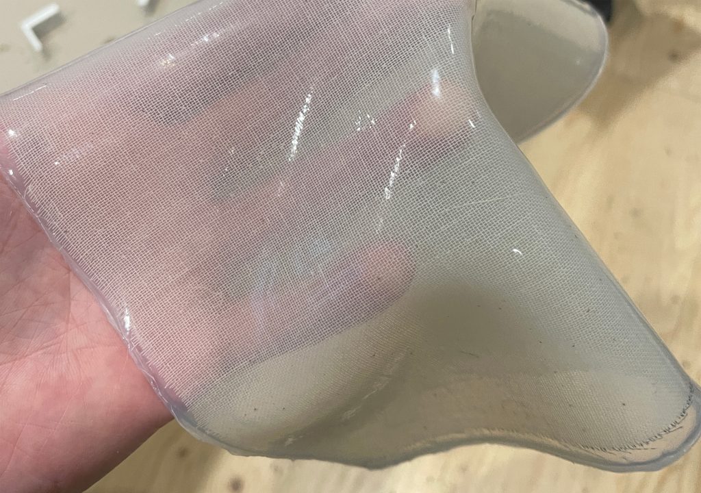 To get the scales more into the skin, instead of on top of it, for a more skin look, we had to cut the silicon in some places. However, silicon tears easy when it has cuts. To solve this problem we added some cloth, to