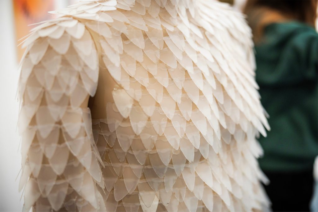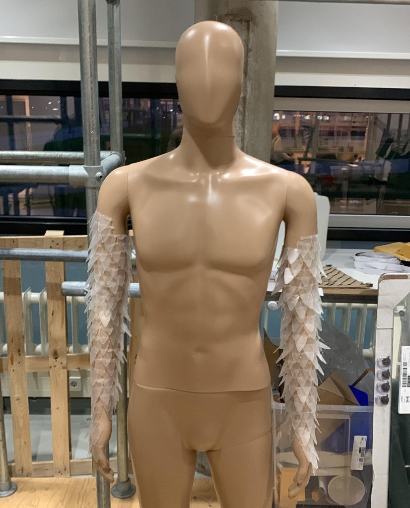 To give our costumers a better view on how the skin would look on the whole body. We ordered a mannequin, cut a lot of scales on 0.28 PP with the laser cutter and glued them on the body with the use of hot glue.